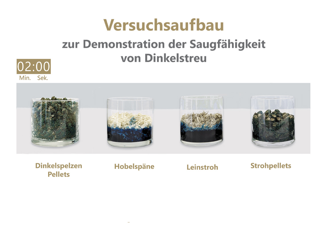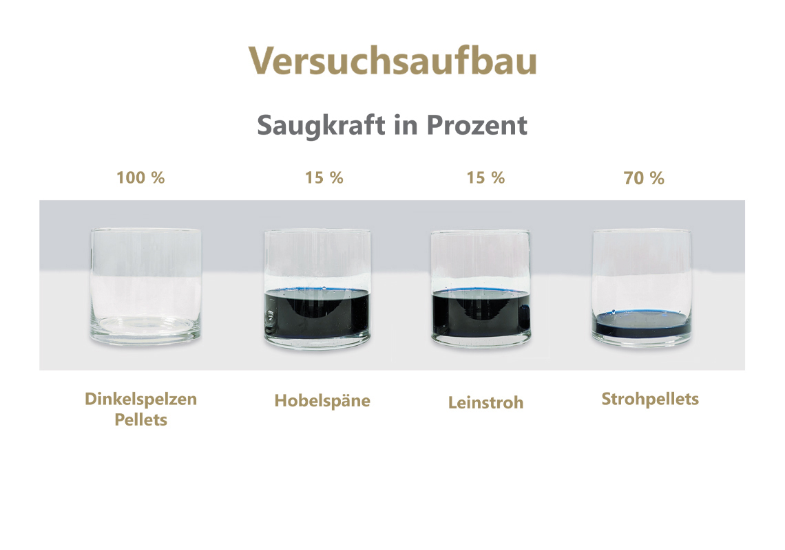 Der Vergleich zeigt die klaren Qualitätsvorteile in puncto Saugfähigkeit gegenüber Holzspäne, Stroh und Strohpellets