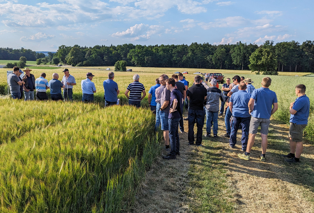 Am 15.06.2023 veranstalteten wir unseren alljährlichen „Kleinen Feldertag“ mit den Schwerpunkten Wintergerste und Dinkel. Gestartet wurde außerhalb vom Versuchsfeld um einen Streifenversuch „Sommergerste als Herbstaussaat“ zu besichtigen. Im Fokus dieser Vorgehensweise liegt hierbei die Möglichkeit Ackerfuchsschwanz durch die sehr späte Aussaat (hier am 03.11.2022) zu unterdrücken und gleichzeitig höhere Erträge wie in Frühjahrsaussaat zu erwirtschaften. Dann ging es im Konvoi aufs eigentliche Versuchsfeld.